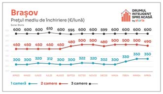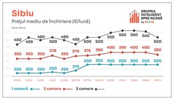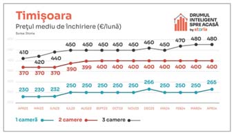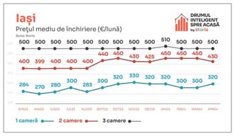 Astfel, în luna aprilie 2024 prețul mediu de închiriere al garsonierelor a fost de 320 de euro, în timp ce apartamentele cu două camere s-au închiriat, în medie, cu 430 de euro, iar apartamentele cu trei camere s-au închiriat cu un preț mediu de 500 euro.