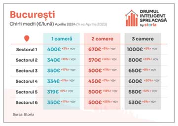 Conform datelor Storia, în luna aprilie apartamentele de închiriat din sectorul 6 au înregistrat cea mai mare creștere de preț comparativ cu anul trecut (+24%), urmate de apartamentele din sectorul 2 (+23%) și de cele din sectoarele 3 și 5 (+16%). Cele mai mici creșteri de preț per sectoare s-au înregistrat în sectorul 1 (+6%) și în sectorul 4 (+12%).