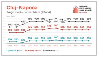 - Cluj-Napoca este orașul în care prețurile chiriilor au stagnat în aprilie vs martie, la toate categoriile de apartamente
