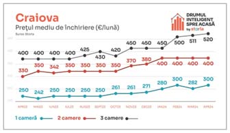Astfel, în luna aprilie 2024, prețul mediu de închiriere al garsonierelor a fost de 300 de euro, în timp ce apartamentele cu două camere s-au închiriat, în medie, cu 380 de euro, iar cele cu trei camere s-au închiriat cu 500 de euro.