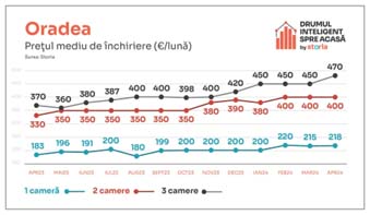 Prețurile solicitate pe Storia pentru chiriile din cele 10 orașe analizate, orașele cu cele mai multe anunțuri de pe platformă, au înregistrat o creștere de 15% de la un an la altul (aprilie 2024 vs. aprilie 2023), în timp ce prețurile solicitate de la o lună la alta (aprilie 2024 vs. martie 2024) au scăzut cu 3%. Astfel, prețul mediu solicitat pentru închirierea garsonierelor și apartamentelor cu două și trei camere, în aprilie 2024, a fost de 498 euro.