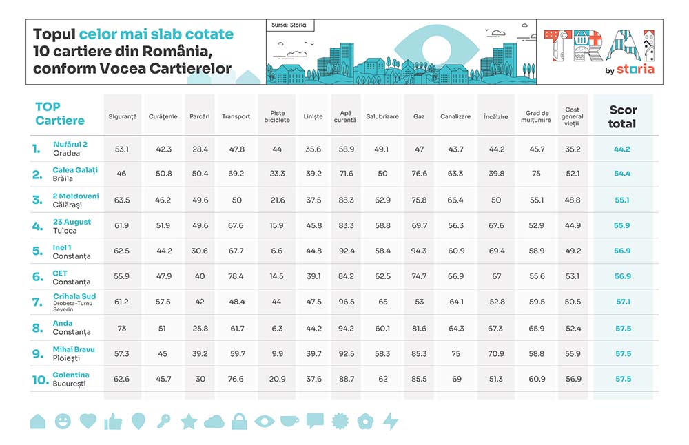 Când vine vorba despre topul celor mai slab cotate 10 cartiere, pe primul loc se regăsește cartierul „Nufărul 2” din Oradea, cu un scor total de 44,2, indicând cele mai negative evaluări, în special din cauza parcărilor, costului general al vieții și curățeniei. Pe locul al doilea în acest top este cartierul „Calea Galați” din Brăila (54,4), care a primit punctaje foarte mici în special la existența pistelor de biciclete, liniște și încălzire. Pe următorul loc în top se regăsește cartierul „2 Moldoveni” (55,1) din Călărași, cu scoruri foarte mici la existența pistelor de biciclete, liniște și curățenie. Următoarele cartiere din top sunt „23 August” (55,9) din Brăila, „Inel 1” (56,9) și „CET” (56,9) din Constanța, dar și „Crihala Sud” (57,1) din Drobeta-Turnu Severin. Pe ultimele trei locuri în acest top, cu același scor, de 57,5 puncte, se regăsesc cartiere precum „Anda” din Constanța, „Mihai Bravu” din Ploiești și „Colentina” din București.