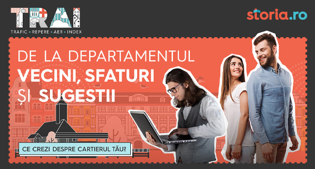 Ca indexul T.R.A.I. să fie complet, avem nevoie de vecini de treabă ca tine, care să ne spună cum e traiul în cartier. Intră pe trai.storia.ro/chestionar și notează cât de sigur simți că este cartierul în care locuiești, care e nivelul de zgomot sau curățenie, care este situația locurilor de parcare, a mijloacelor de transport în comun, a pistelor de biciclete și nu numai.