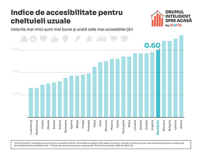 România are cele mai accesibile prețuri la locuințe din jumătatea de est a Europei raportat la salariul mediu net lunar. În același timp, România este pe ultimele poziții în Uniunea Europeană la ușurința cu care locuitorii plătesc facturile la utilități și își acoperă cheltuielile uzuale pentru alimente, mese la restaurant sau cumpărarea de bunuri, potrivit unui studiu realizat de Storia - platforma lansată de OLX.