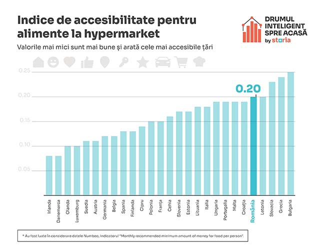 Pe categorii specifice, România ocupă doar locul 24 din 27 la indicele de accesibilitate pentru cheltuielile la hypermarket pentru o lună cu un indice de 0,2, la egalitate cu Letonia, în timp ce singurele țări din Uniunea Europeană care au un indice mai slab sunt Slovacia (0,23), Grecia (0,24) și Bulgaria (0,25).
