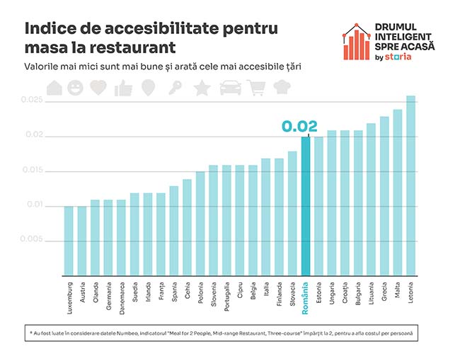 În cazul unei mese la restaurant cu fel principal, fel secundar și desert pentru o persoană, România stă ceva mai bine și ocupă locul 19 din 27, cu un indice de accesibilitate de 0,02, mai bun comparativ cu țări din regiune precum Ungaria, Bulgaria și Croația (0,021) sau Grecia (0,023).