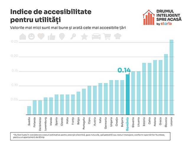 Pe de altă parte, și în acest caz se observă că România are un indice de accesibilitate mai bun sau apropiat comparativ cu statele din Estul Europei: dacă Bulgaria și Ungaria stau ușor mai bine cu un indice foarte apropiat (0,12), în țări precum Slovenia, Cehia, Polonia, Grecia sau Slovacia facturile la utilități sunt mai dificil de plătit.