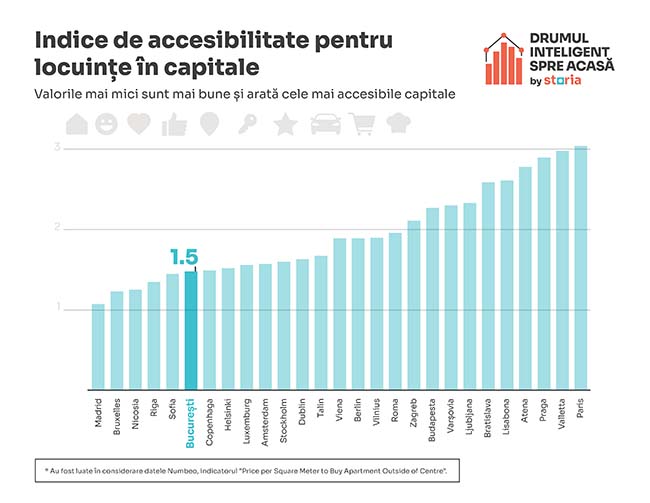 Pe de altă parte, București este printre cele mai accesibile capitale din Uniunea Europeană la achiziția de locuințe, atunci când sunt luate în calcul salariile medii nete și prețul mediu pe metrul pătrat din capitale. Astfel, capitala României ocupă locul 6 din 27 în Uniunea Europeană la acest capitol, cu un indice de accesibilitate de 1,5, iar singurele capitale mai accesibile pentru imobiliare sunt Madrid (indice 1,08), Bruxelles (1,23), Nicosia (1,25), Riga (1,35) și Sofia (1,45). La polul opus se află Praga (2,9), Valletta (2,98) și Paris, care este și singura capitală cu un indice mai mare de 3, și anume 3,04.