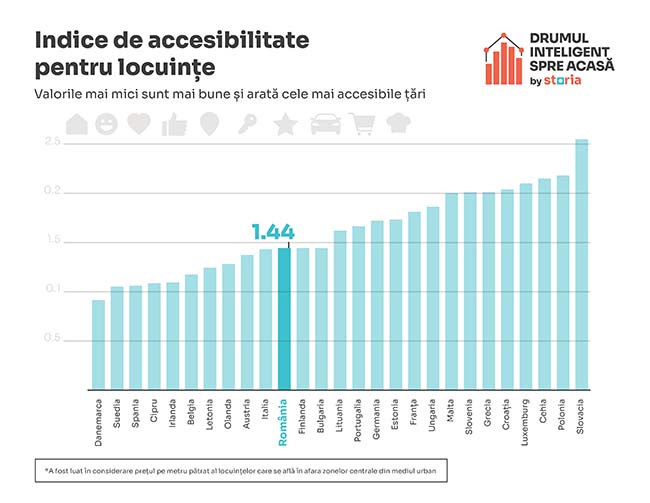 Astfel, indicele de accesibilitate pentru piața imobiliară din România, calculat ca raport între prețul mediu pe metru pătrat pentru o locuință rezidențială conform platformei Numbeo și salariul mediu net lunar conform Institutului Național de Statistică, este de 1,44, în condițiile în care o locuință este cu atât mai accesibilă cu cât valoarea indicelui este mai mică.